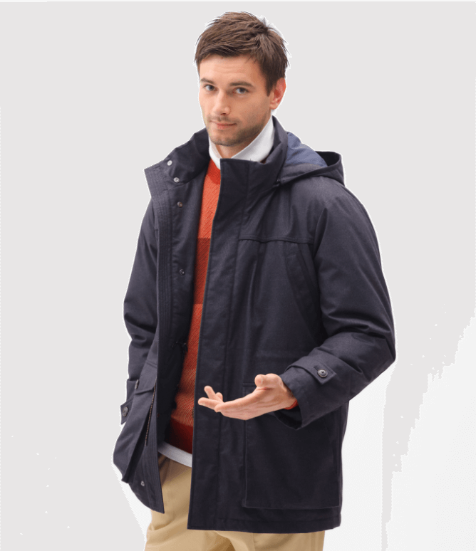 機能性とデザイン性を兼ね備えたピーコートは風の侵入を防ぐため立てて着ることも可能で、襟元をしっかりと保温します。また裏地がないデザインの為通常より軽い仕上がりが特徴。