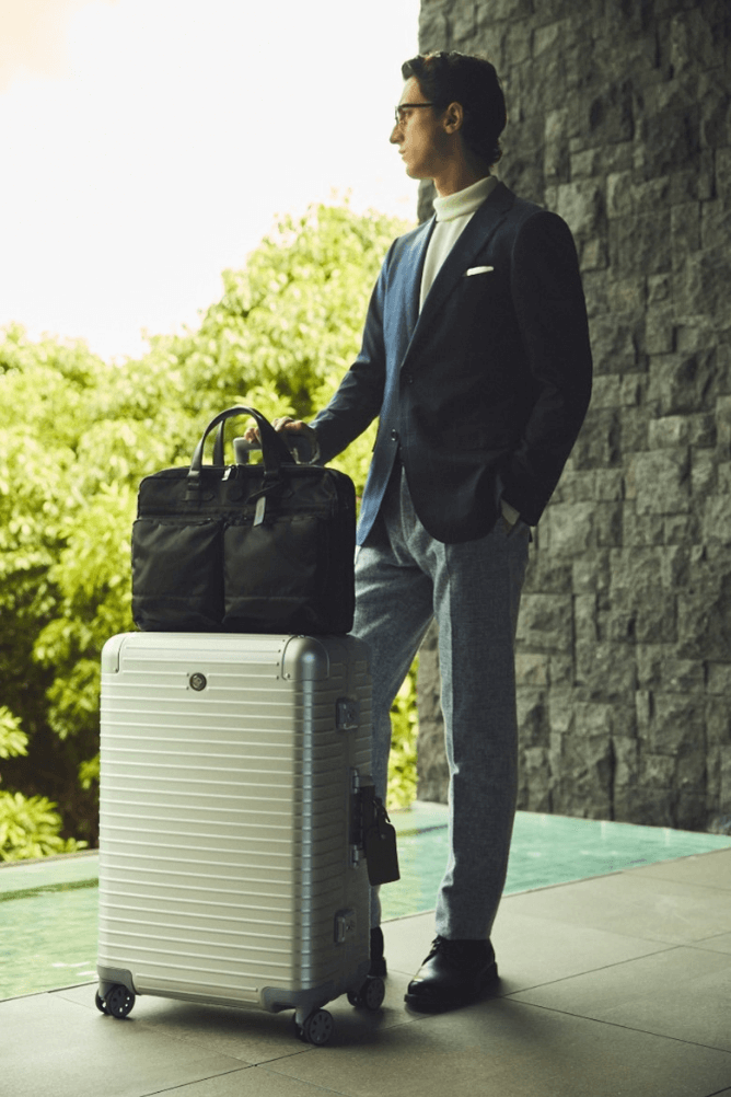ヘアライン加工を施した高級感漂うアルミボディに、クラフト感のある革巻きハンドルやラゲージタグをあしらい、洗練された上質さと特別感を表現しています。 -