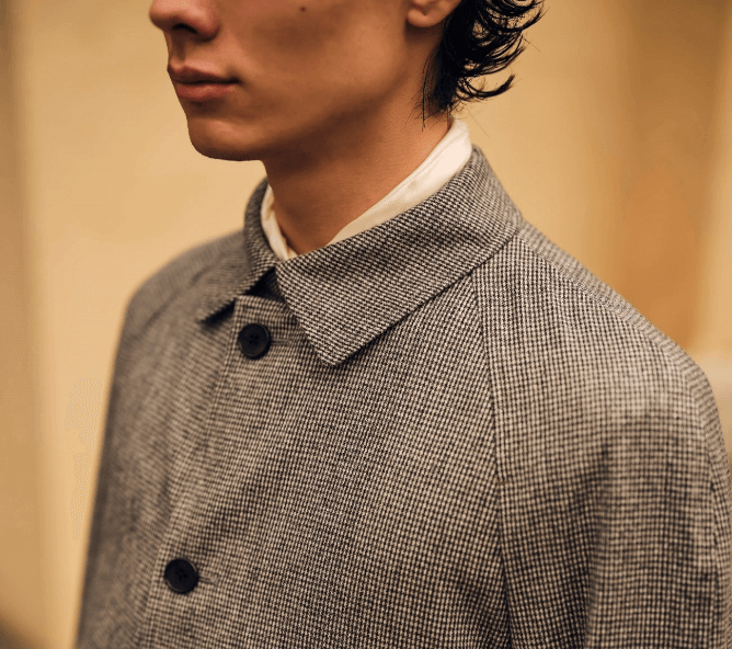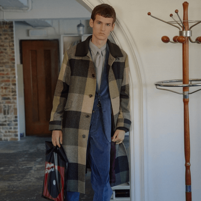 150年以上続くアイリッシュツイードの老舗生地メーカーMageeのラージチェック生地を使用したコート。ウールリブの衿が特徴的なコートは大胆なチェックとAラインシルエットが絶妙にマッチしています。