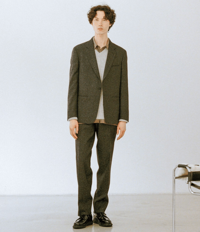 シルク独特の光沢感を持ったウールシルクの素材は、クラシックなソフトツイード調の織物では見られないラグジュアリーな仕上がり。ウレタン混で現代的なフィットのセットアップを快適な着心地にしています。フライフロントの前立てや、ポケットの両玉縁仕上げによりクリーンな印象にご着用いただけます。