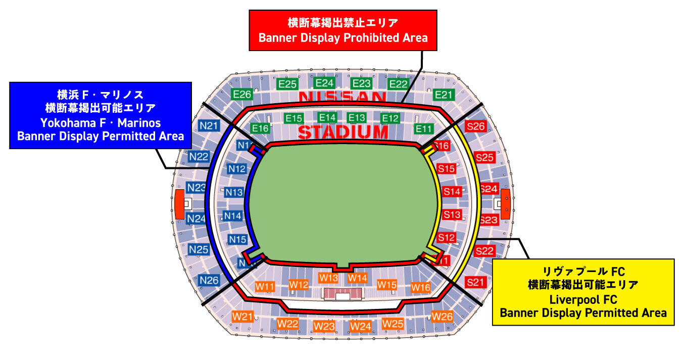 Banners may only be displayed within the designated 'Banner Display Area' indicated below. ※横浜F・マリノスの観戦マナー&ルールは以下の運用となるため掲出は不可となります。https://www.f-marinos.com/news/match/8929 - 横断幕のスタンドへの持ち込み、ならびに掲出は開場後となります。原則、事前の持込みはできません。